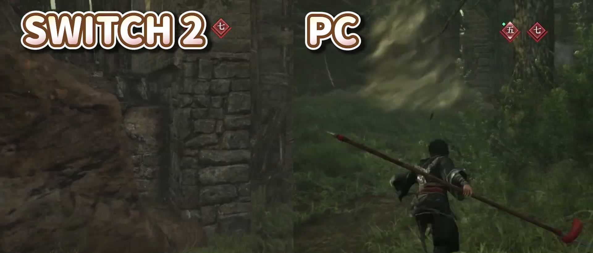 當然為了在掌機硬體上跑出這樣的效能,畫質上還是有所妥協。比起次世代主機版本,Switch 2 版在環境光遮蔽、陰影品質、動態光影和地表細節等方面有所不同(有所不同)[b]。
