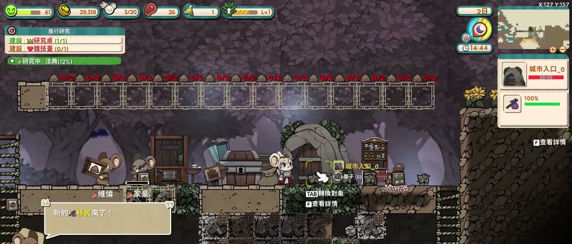 前期蓋完城市入口後,就要準備迎接新鼠民,每隔一段時間,就會有新的移民從城市入口進來,在接納新移民的時候一定要仔細看說明,千萬不要直接把人口塞滿,因為大量的人口意味著更多的食物以及娛樂需求,若資源跟不上很容易崩盤,所以要謹慎管理人口,遊戲剛開始大概保持在人口上限的一半左右數量,勞動力夠用即可,接下來的人口位置,就可以好好的挑選移民,只讓優質老鼠加入。