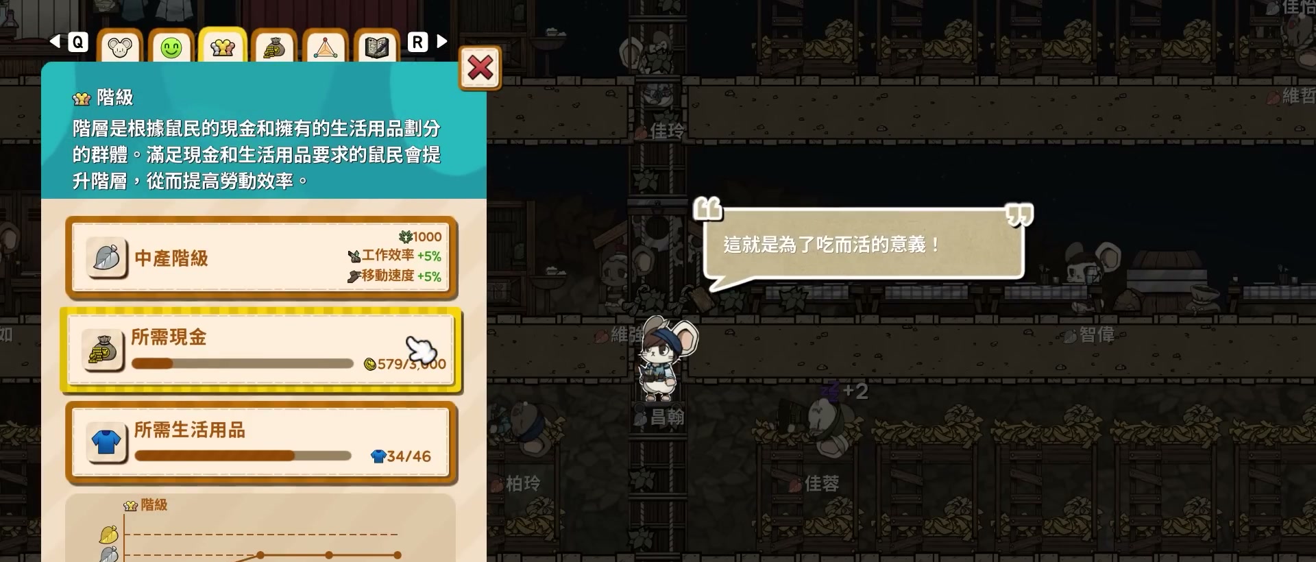 想知道差多少提升,可以點開每個老鼠的面板,切到階級這一頁,就能看到需要的現金和生活用品,現金基本上只要有工作,就能穩定的持續上升,比較會遺漏的是生活用品。