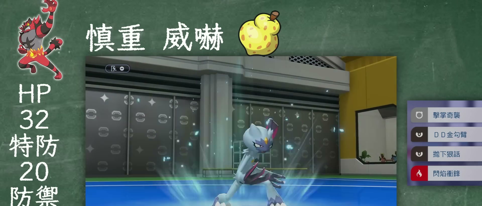雙打的配法是性格選慎重加特防,能力點HP配32、特防配大概18到20、剩下補防禦,特性就是威嚇沒有別的選擇,招式帶擊掌奇襲、DD金勾臂、閃焰衝鋒加拋下狠話,擊掌奇襲第一回合直接讓對面一隻不能動,拋下狠話降完能力還能安全退場再觸發一次威嚇,持有物推薦帶文柚果,雙打裡面所有物理攻擊手都會被威嚇壓一波傷害,需要安全起動的脆皮隊友旁邊有它就能安心開招。