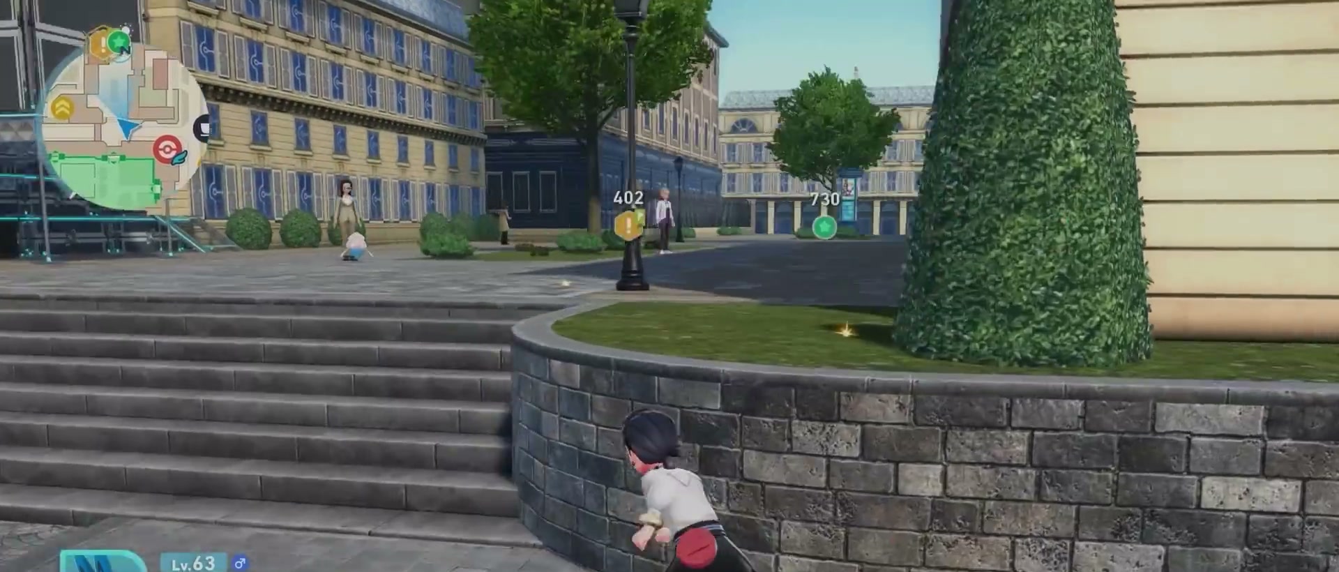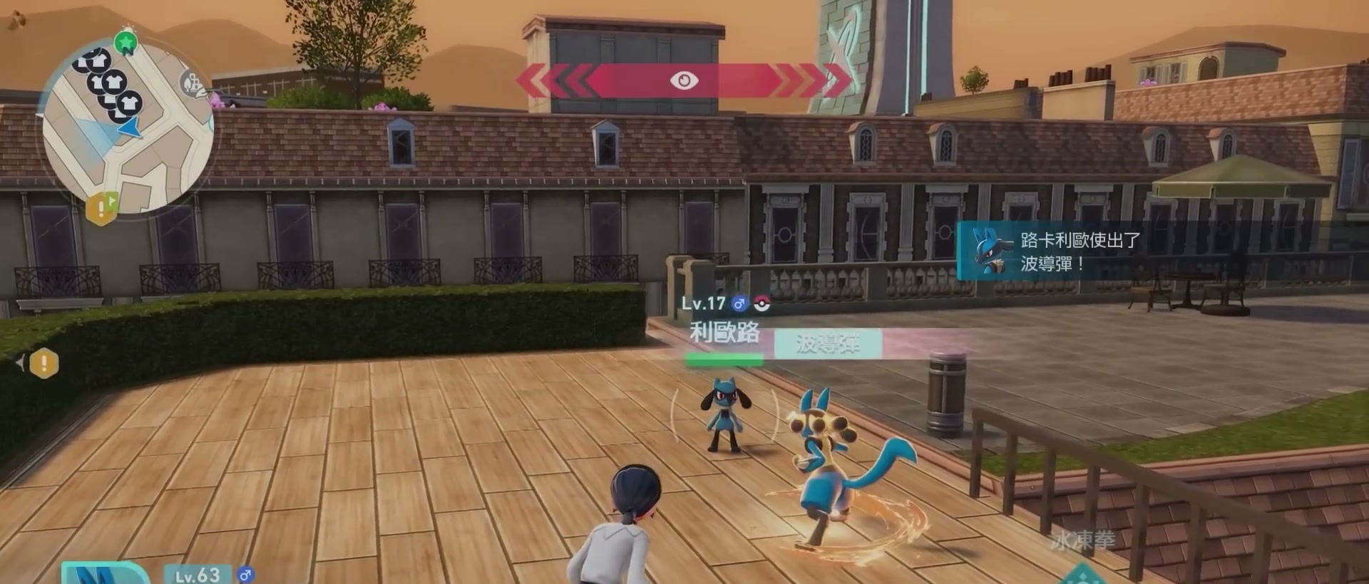 接下來是高人氣寶可夢利歐路,他出現位置在地圖左上方,榴紅4號街區的屋頂,首先要來到這塊街區建築的左下方,因為這裡有一架梯子可以爬,爬上去後就能直接看到利歐路了,另外要注意,利歐路只有在晴天時才會出現,可以打開地圖看右上角當前的天氣,如果是一顆太陽就代表晴天了。