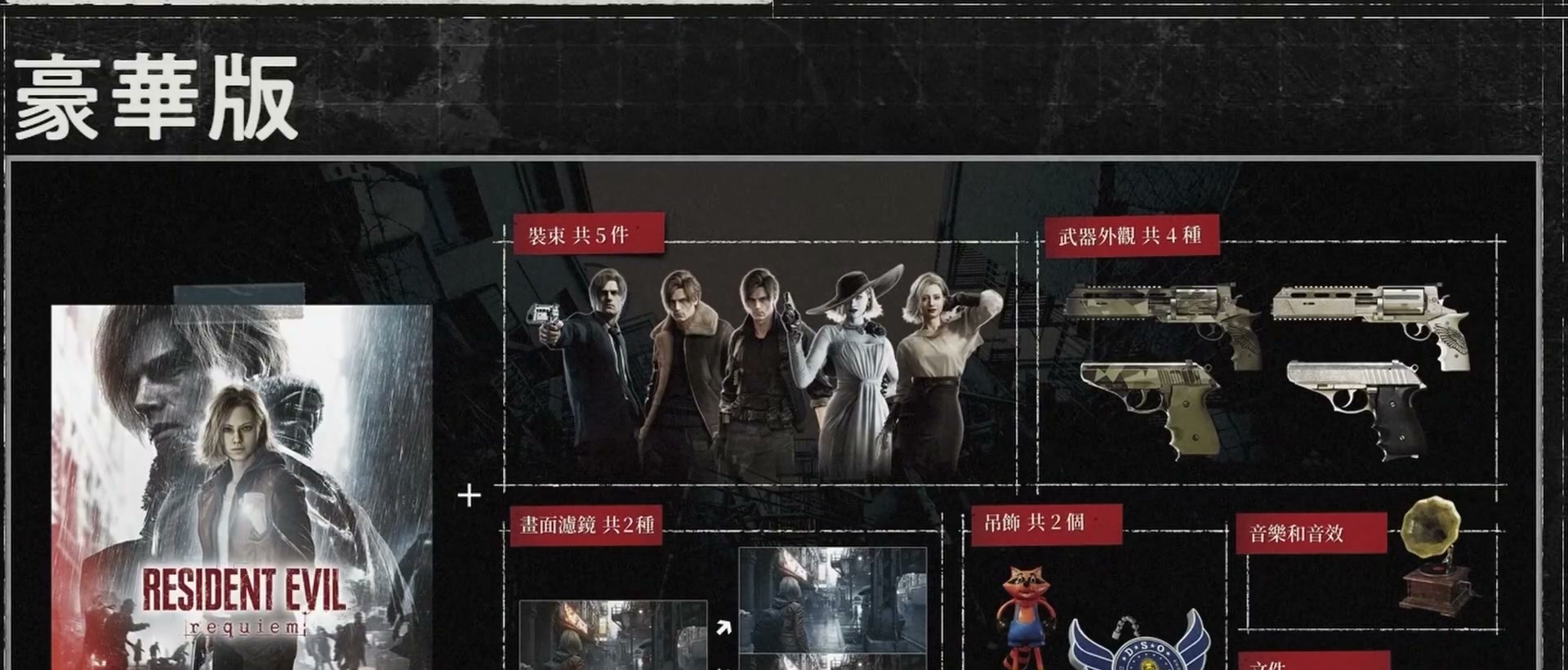 預購特典贈送的是葛蕾斯的服裝「末日」,豪華版則多了豪華包,包含多套服裝、武器造型、吊飾等等,以及可在遊戲內閱讀的文件,個人覺得最酷的是畫面濾鏡,能切換成黑白電影或末日氛圍的調色,還有服裝也很讚,甚至能打扮成8代的夫人,用前作boss的造型玩一定超爽阿。